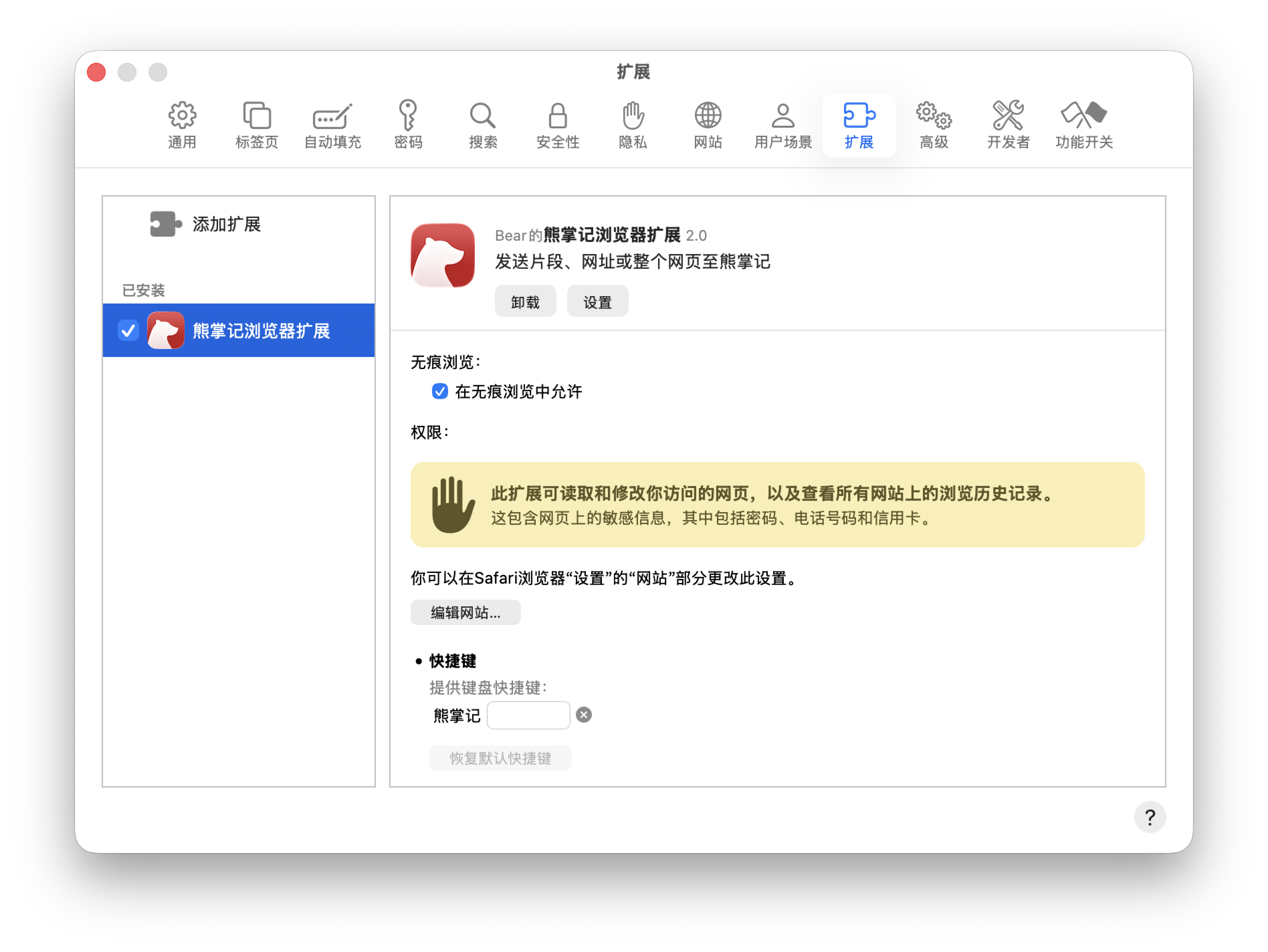 Safari 浏览器: 熊掌记扩展会随应用自动安装