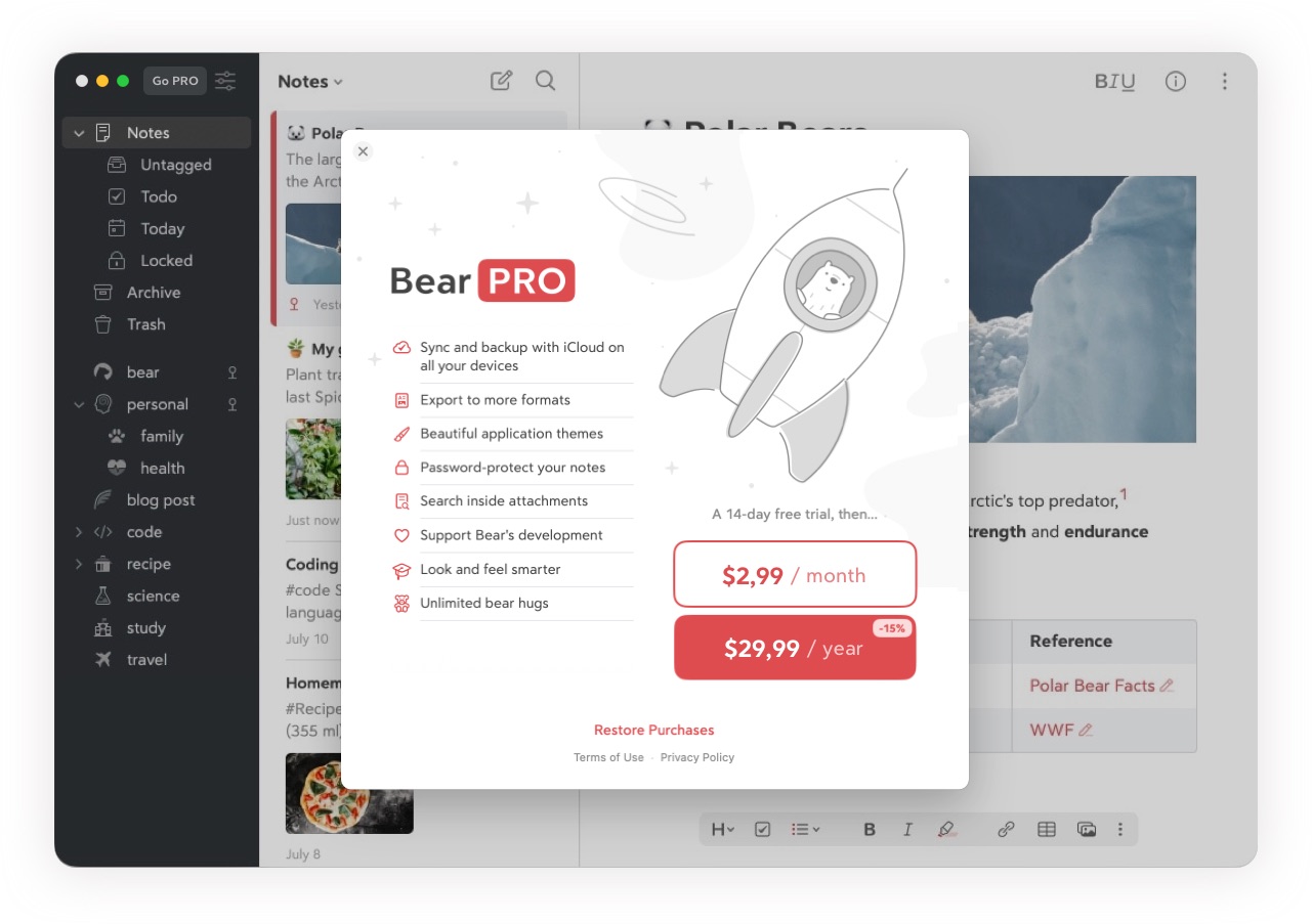You’ll see a quick summary of Bear Pro features and our privacy policy, along with the available in-app purchase options. All purchases are managed through your Account section in the Mac or iOS App Store.