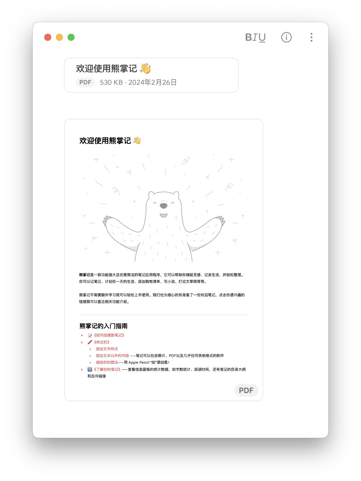 熊掌记可以在编辑器内预览 PDF 文件。要展开阅读 PDF,只需双击(Mac)或轻按(iOS)它。