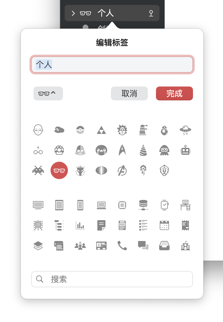 - 滚动显示的标签图标列表或使用关键字进行搜索