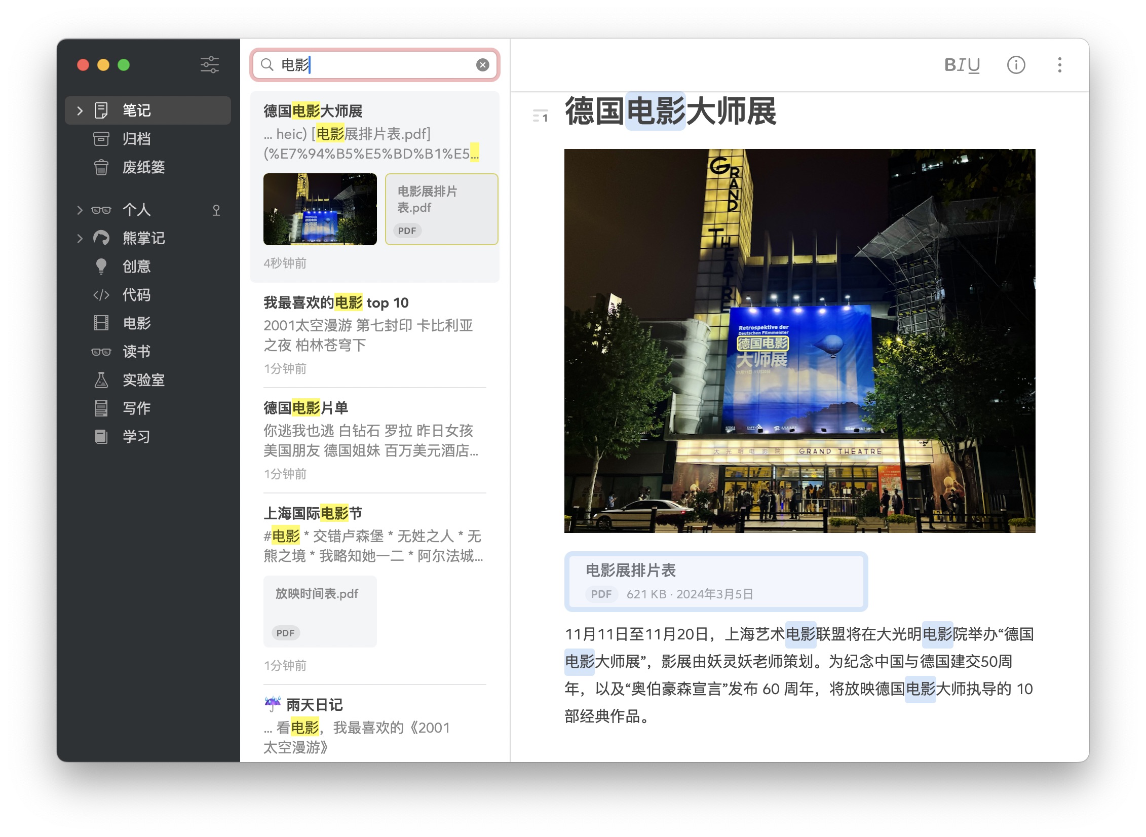 - 在搜索框中输入关键字或短语,熊掌记会随着你的输入同步进行搜索