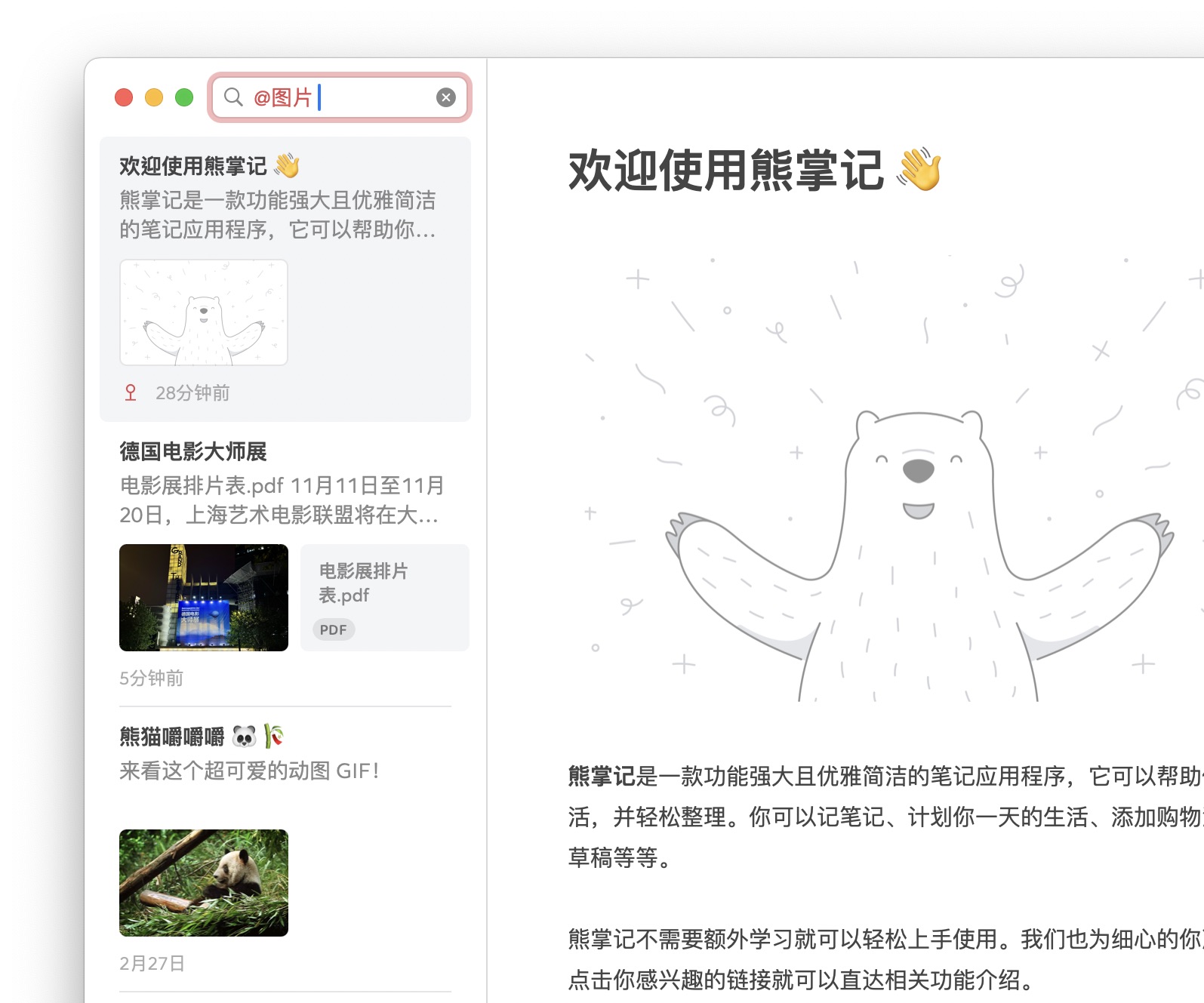 这些特殊搜索可与任何搜索字词结合使用,以获得更好的搜索结果。例如:搜索 @图片 @待办 “熊掌记常见问题” 将显示所有包含图片和未完成的待办事项,以及精确关键词“熊掌记常见问题”的笔记。