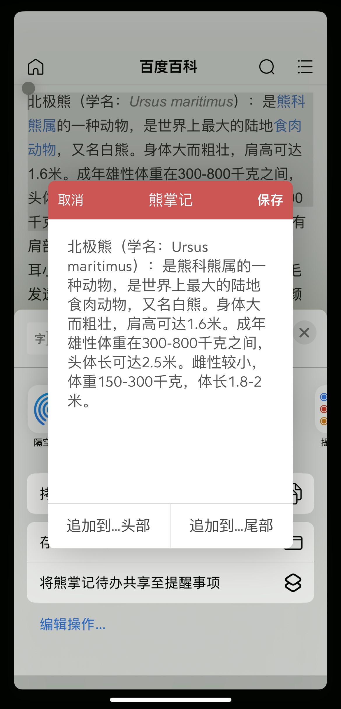 应用程序扩展中将显示可预览笔记并提供部分选项的对话框。按下保存即可创建新笔记,也可选择追加到…头部或追加到…尾部将内容加入已存在的笔记中。