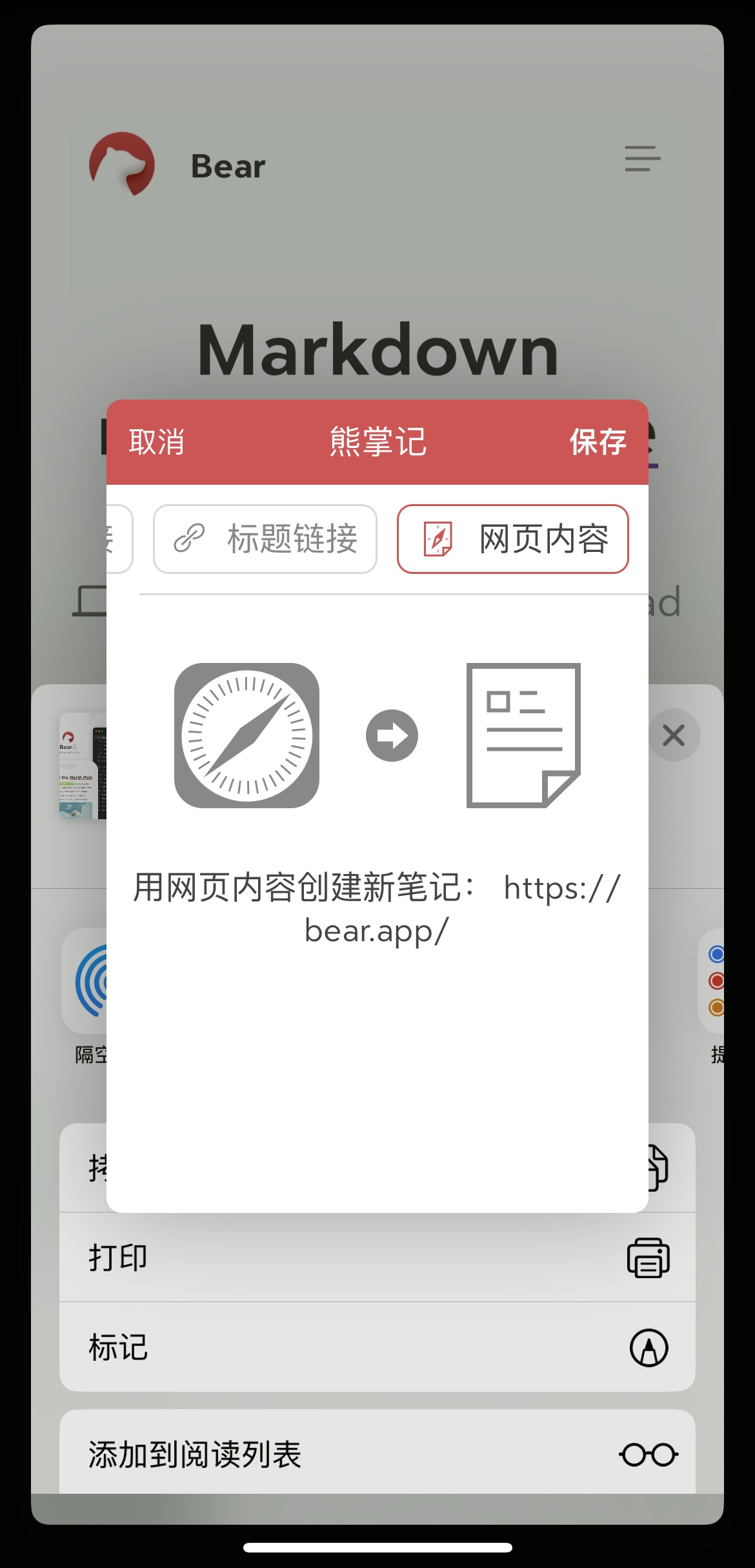 熊掌记的 iOS 扩展可抓取整个网页内容。从浏览器中调用熊掌记扩展后,在顶部菜单选择网页内容并轻按保存。之后,熊掌记将会尝试获取网页内容并裁剪。