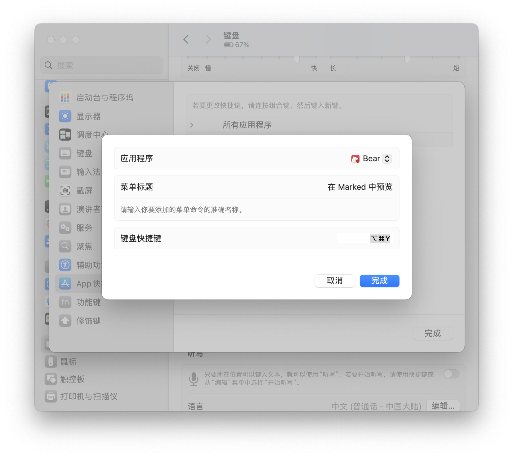 在 macOS 中你可以为特定的应用程序功能指定或重新指定自定义的键盘组合键。当你对熊掌记的默认快捷按键不满意,或者按键与其他程序冲突时,即可使用此功能。自定义快捷键仅适用于应用程序菜单栏内提供的功能。