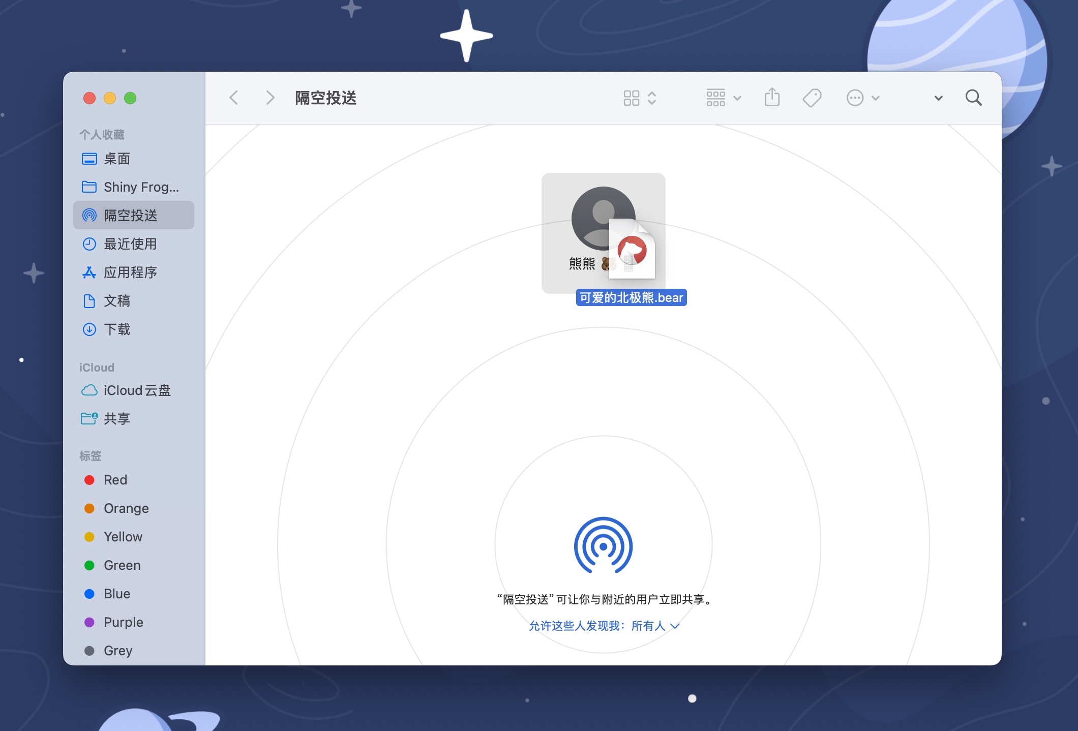 在 macOS 上您还可以通过在访达中使用“隔空投送”选项卡来传输熊掌记笔记。将您的笔记保存为 .bear 文件并将它们拖放到目标设备。文件传输至 macOS 后,双击文件即可导入笔记到熊掌记中。