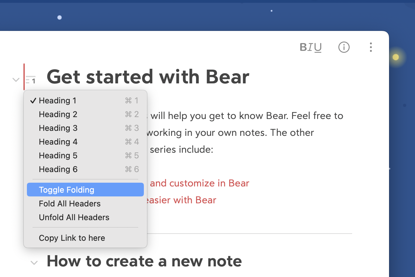 Bear supports folding sections to help you view and edit your notes better. You can fold headings (H1-H6) and multi-level lists, including to-dos. There are multiple ways to fold a section: