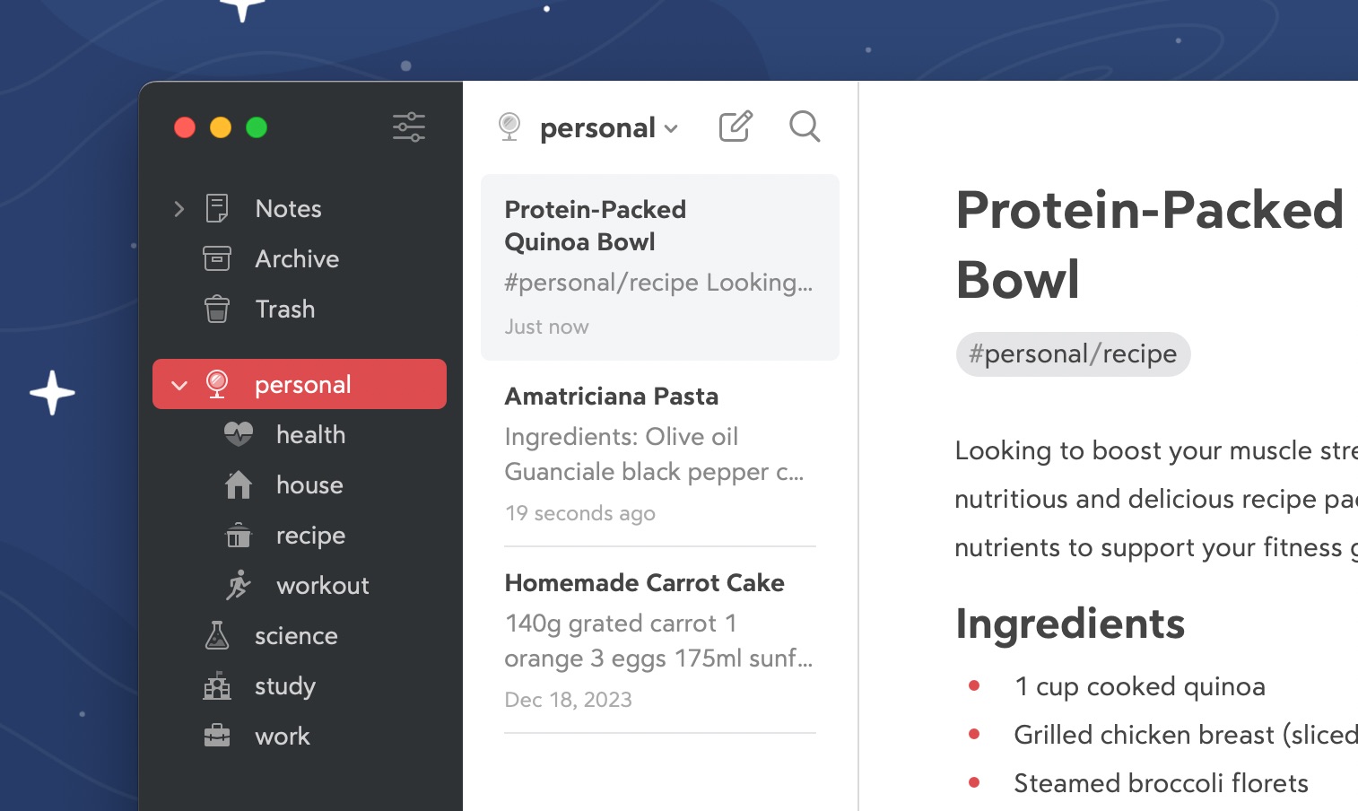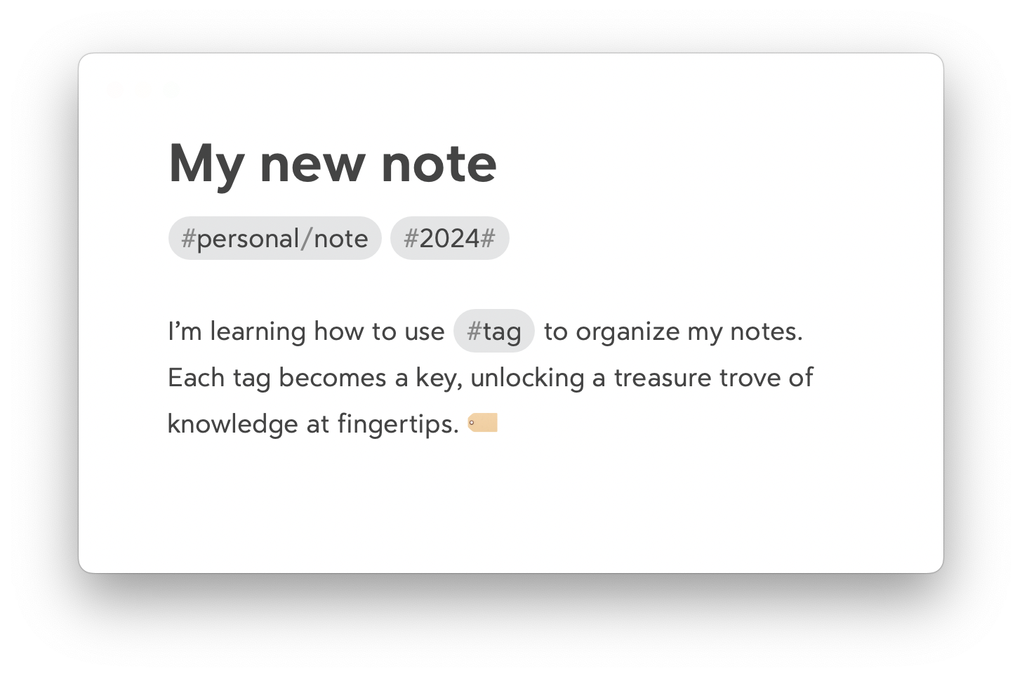 Tags can be nested within other tags, just like folders in a typical file structure. This is great for things like keeping a journal, collecting related tags under parent topic, and more. You can have as many nested tag levels as you want.