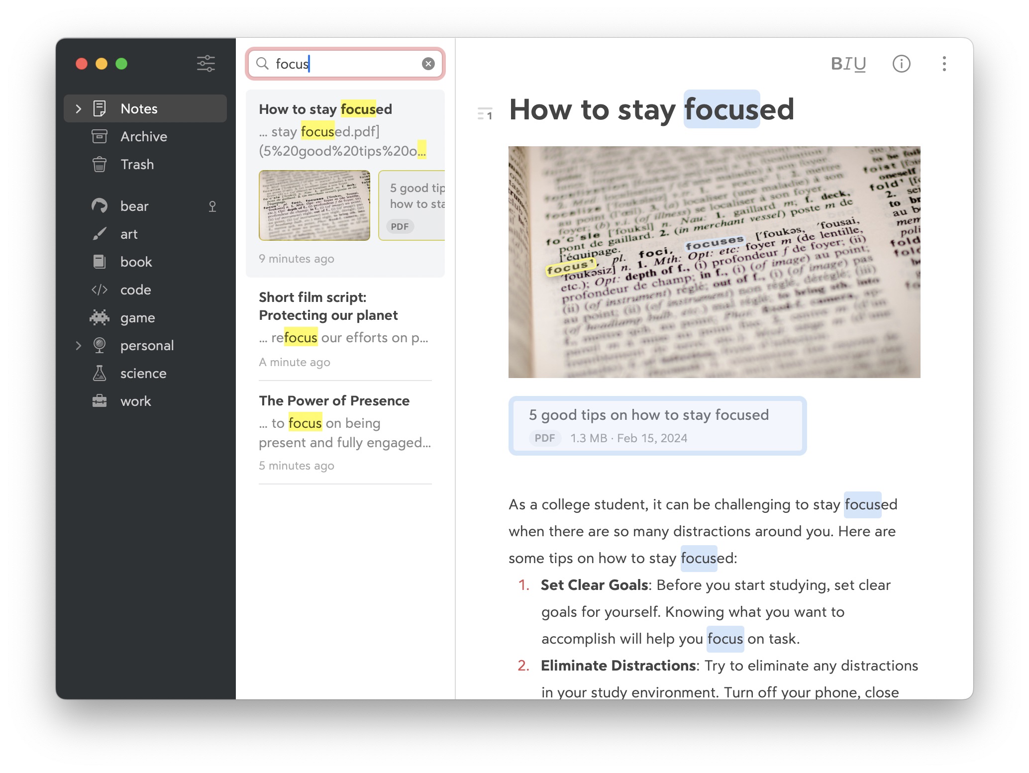 With Bear Pro, Bear can search text inside photos and PDFs attached to the note. This in-note search tool also has a Replace option to change keywords and phrases across all text in the note.