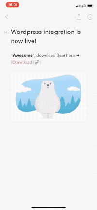 - Photos are supported - Photos in your Bear note will be passed along to WordPress for processing. Note: WordPress themes process photos differently, and Bear has no control over this