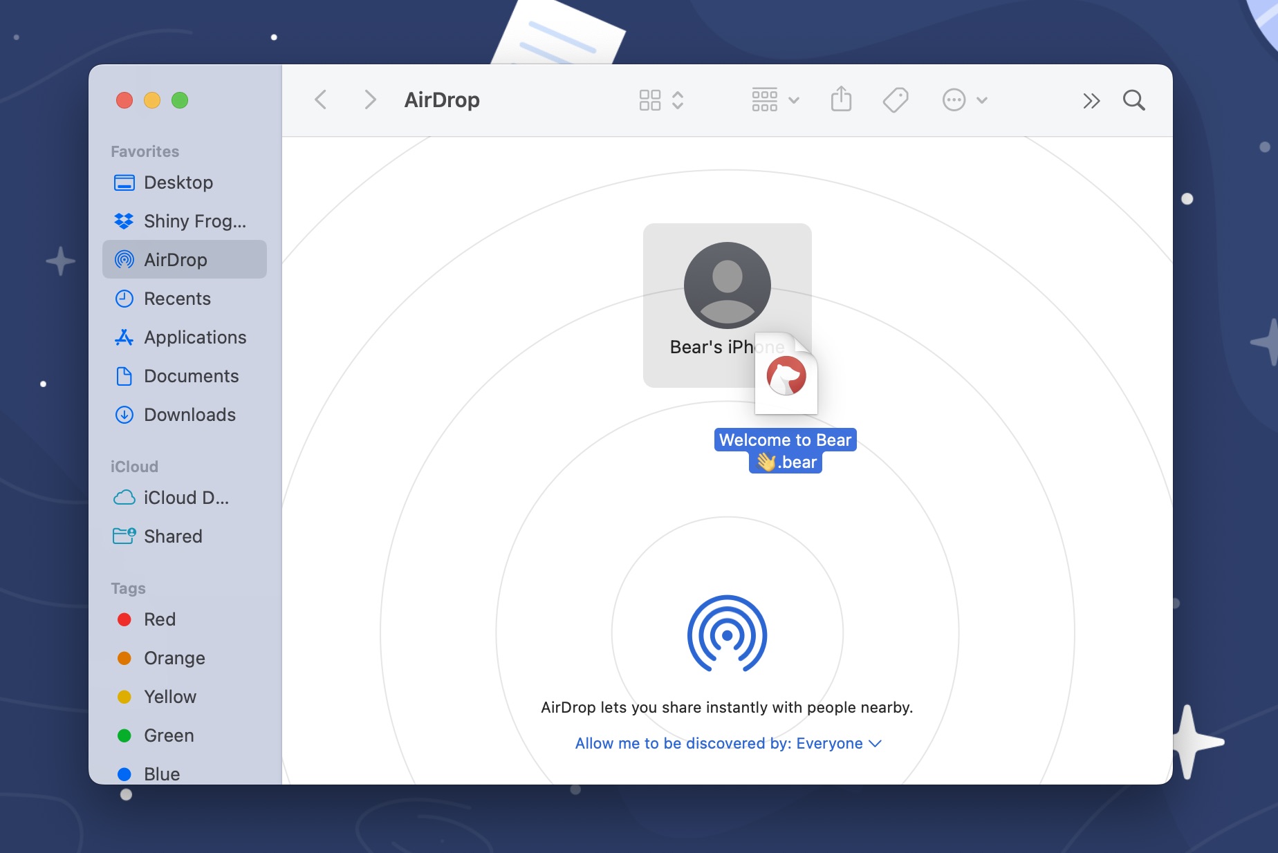 Apple’s AirDrop feature is an easy way to share your Bear notes with friends, coworkers, family, or just between your own devices. It’s easier and faster than using text messaging, thumb drives, or emailing files around.
