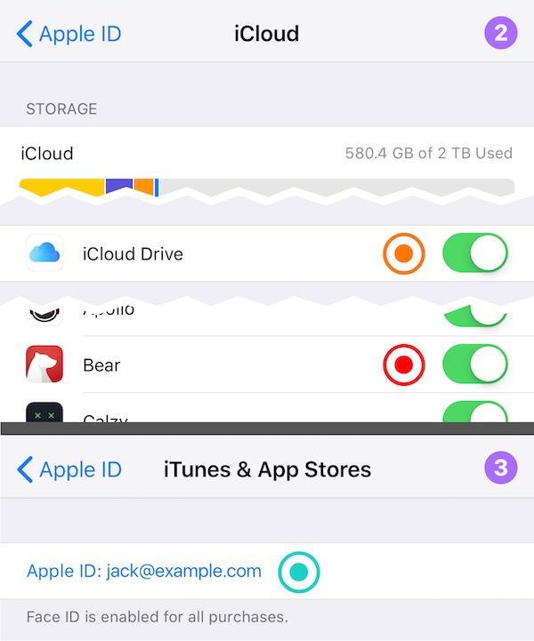 For example: you could be signed into iCloud with my-apple-id@example.com on all devices (marked with ◉ in the next screenshots), and also signed into the App Store with app-store-shopping@example.com on all devices (marked with ◉ in the next screenshots) and Bear synchronization will work like a charm.