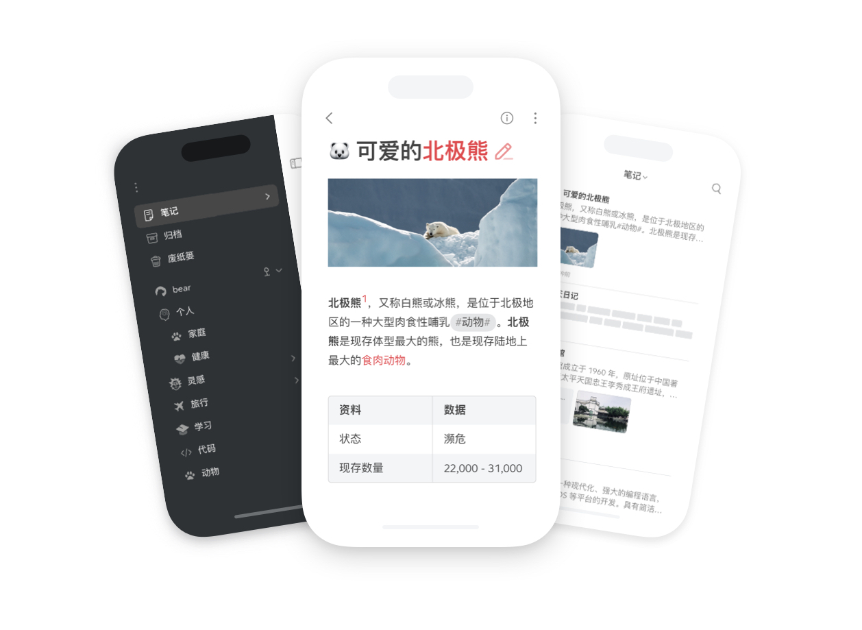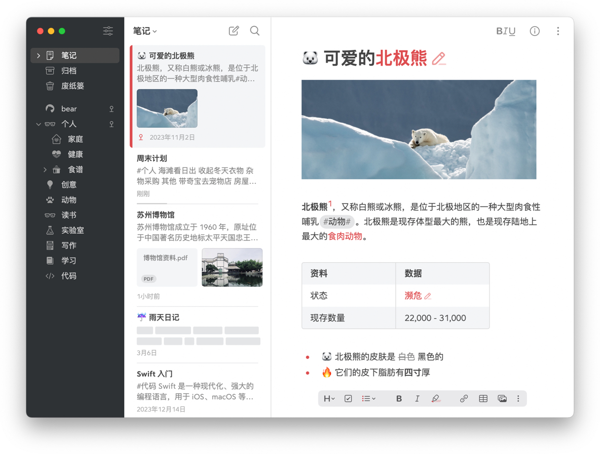 Bear 就像笔记应用中的瑞士军刀,在设计上精致与易用,功能上强大却不失便捷。