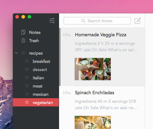 If you want a deeper way to organise your notes, Bear allows you to structure your tags in simple hierarchies. Let’s say you have a recipes tag which contains all your favorite food preparations, but you want to quickly find all the vegetarian ones. In this scenario all you have to do is to insert this tag in all your vegetarian recipes: